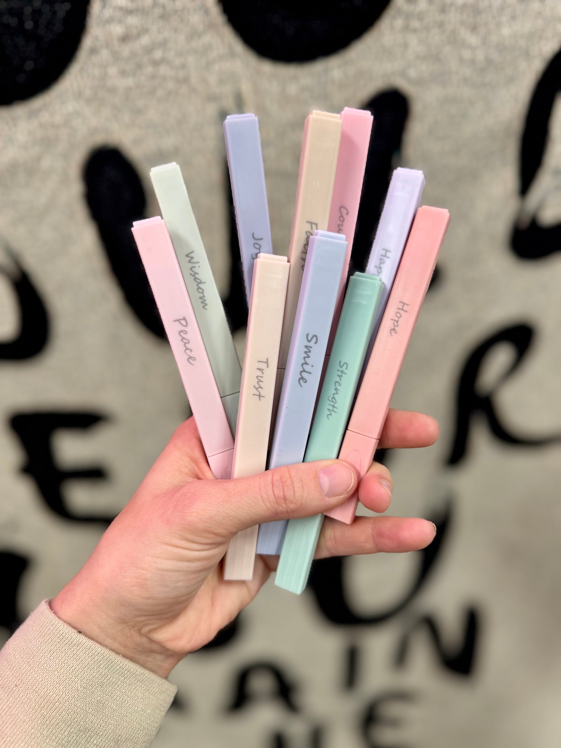 With 10 soft pastel colors these highlighters make adding a touch of color to notes and text easy and enjoyable! Each has a word inscribed on the end!